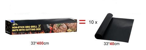 FREE CUT & MULTIPURPOSE: 33 * 400cm, 0.2mm thick, with cutting box, can be cut freely depending on the size of the grill. Suitable for various grills, such as gas grill, charcoal grill, electric grill. It can also be used as a baking mat. If you put it in an oven, please make sure the temperature flies below 500 °.